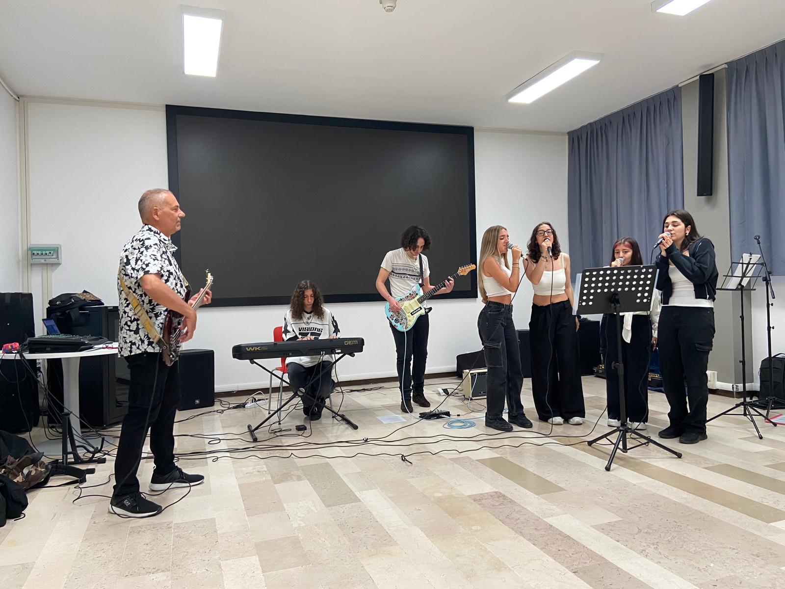 I professori Spagliarisi, Stasi e Annecchiarico hanno pian piano dato forma alla loro idea e l’hanno trasformata in un progetto concreto; grazie al coinvolgimento di una squadra formidabile di studenti, il progetto è diventato una realtà. Emma, Noemi, Melissa, Giorgia, Domenico e Dominik hanno accettato la sfida. Questi giovani talenti si sono messi in gioco e giovedì sera il lavoro di tanti mesi è stato ripagato da uno scroscio di applausi. Con le loro facce pulite, la loro freschezza, il loro entusiasmo e la voglia di fare, i ragazzi della band hanno emozionato e incantato tutti.